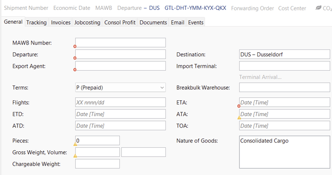 - The input screen for the new consolidation shipment will open.