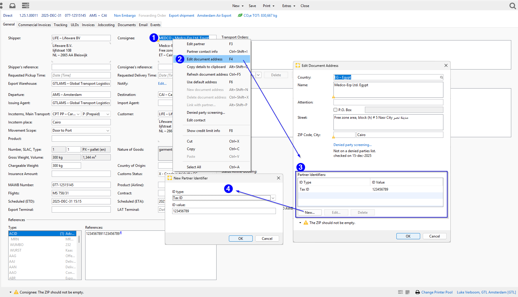 - Egyptian freight forwarder code (for consolidated shipments, a 9-digit number issued by the Egyptian Tax Authority uniquely identifying all registered importers in Egypt)