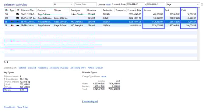 In case the Transit indication of a charge type is changed (check or uncheck the option 'Transit item' on Master Data > Finance > Charge Types) while jobcosting lines have already been created making use of this charge type, the gross margin as reported in the Shipment Overview might not be up-to-date. A recalculation will be required for all existing shipments if the Transit indicator is adjusted. Recalculation takes place automatically if you make a change to the shipment and then save the shipment. Please contact Riege Support in case a recalculation is required for many shipments that you do not expect to change any time soon, so that we can configure this recalculation for a specific period in the system settings.