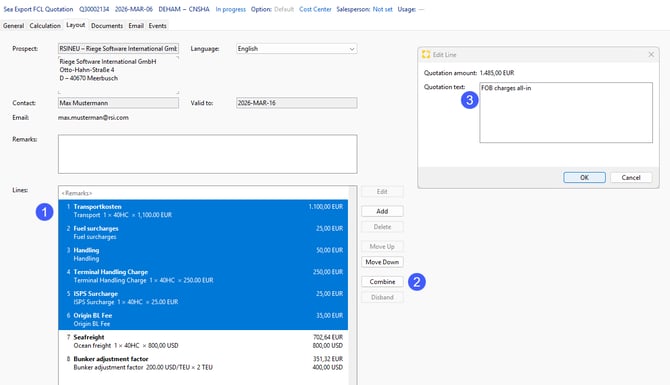Create your quotation as usual with different charge types and costs/income in the “Calculation” tab. In the “Layout” tab, you can then select multiple charge types (1) that you want to combine, by holding down the Ctrl key on your keyboard. Then click on "Combine" (2). A pop-up window open, where you can assign a new name (3) to the combined charge types, e.g. “FOB charges all-in”.