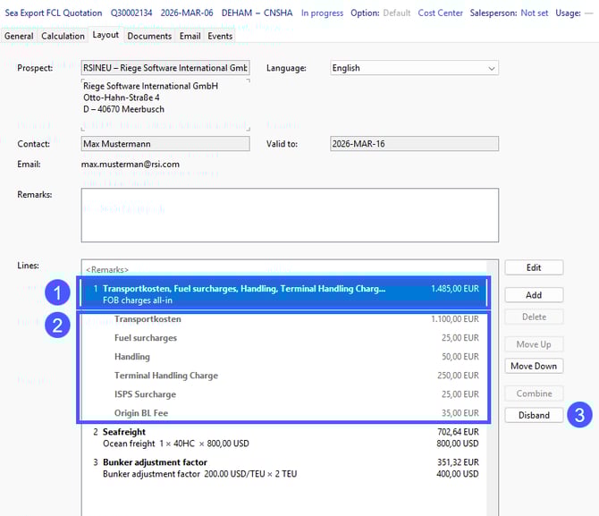 The overview of the quotation lines has now changed, and the newly named line (1) “FOB-charges all-in” represents the total of all greyed out charge types (2).