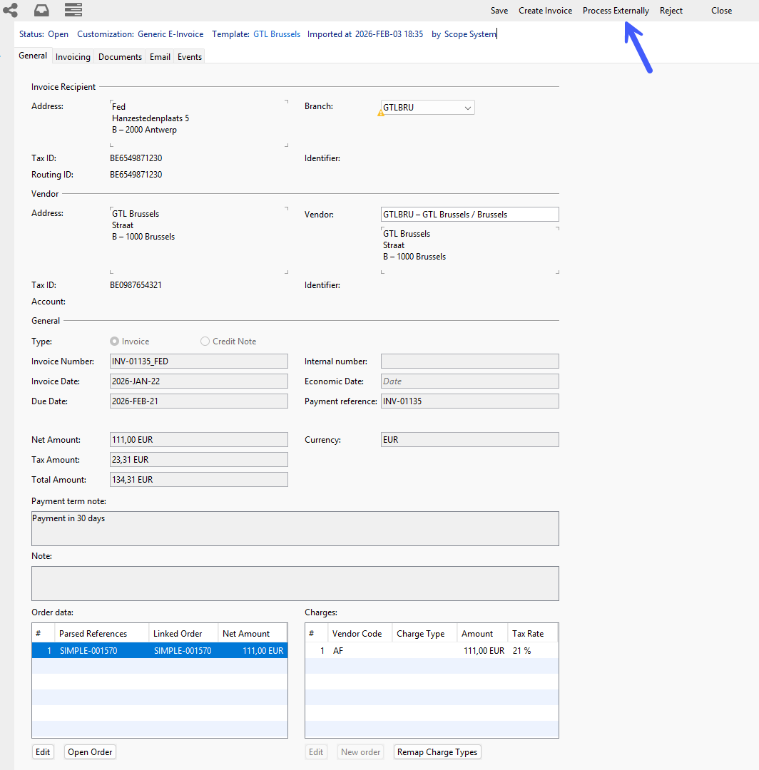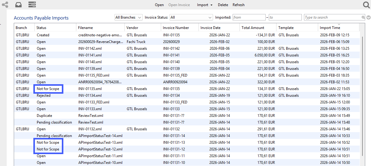 If you do not want to make use of the automated classification, you can still manually check imported invoices and decide to choose to process them externally and set the status “Not for Scope”.