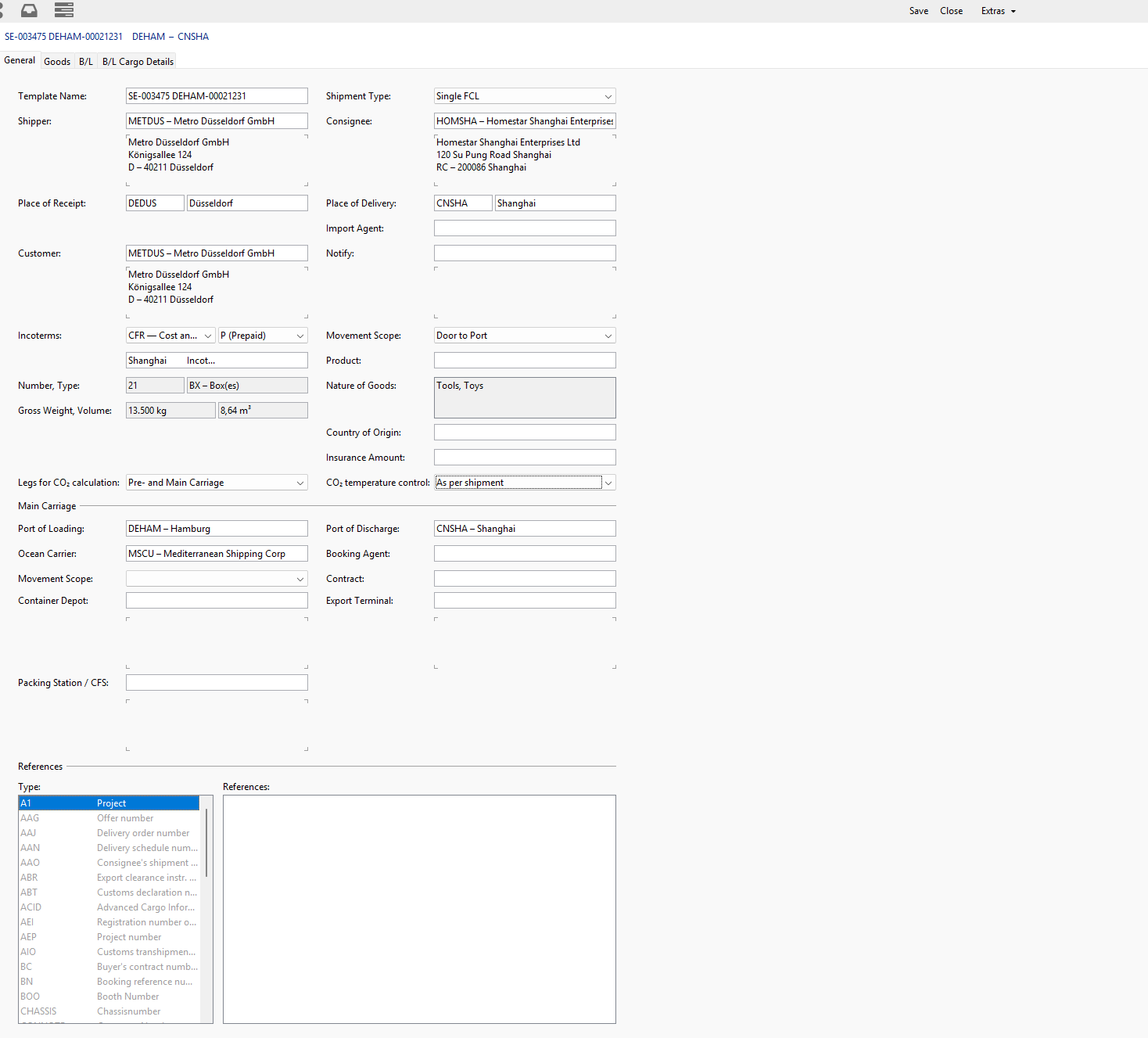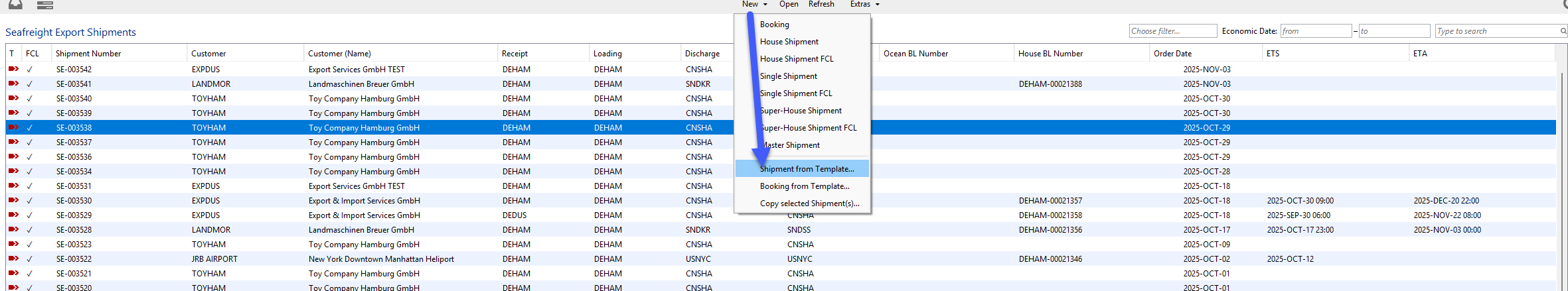 Seafreight Export Shipment: in the general tab of the shipment the „Extras“ action allows a selection of possible actions that are related to the current order.