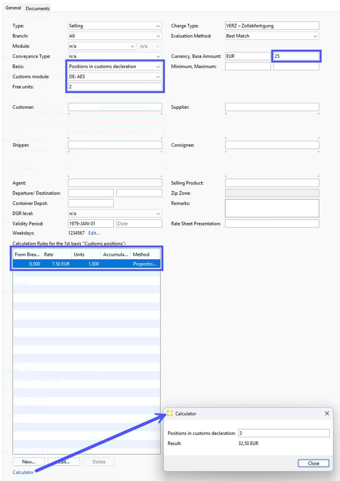 Beispiel: You want to charge your customer for the customs declaration in the module AES a base amount of 25.00 EUR, including 2 free positions and for each additional position another 7.50 EUR.
