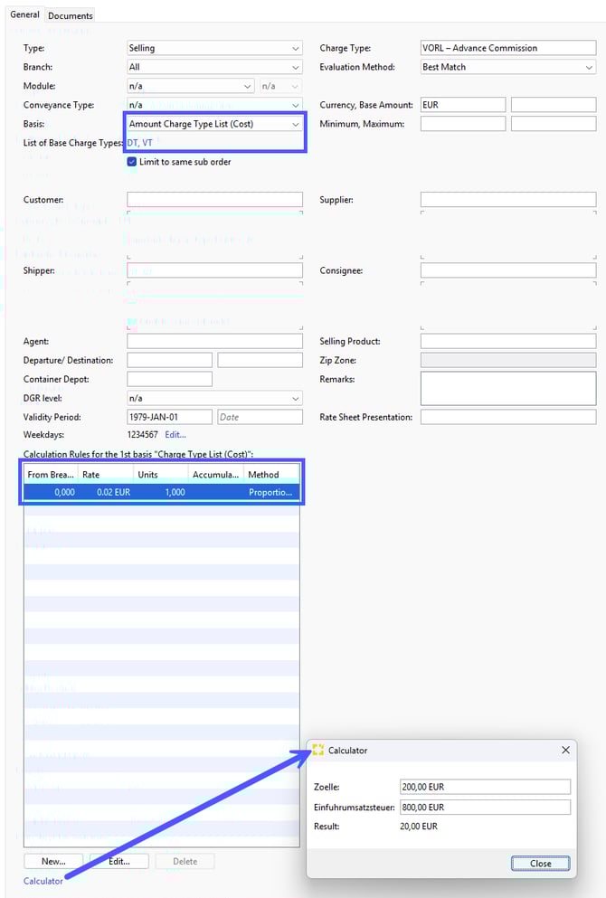 Example: You want to charge your customer the advance commission at a rate of 2% based on the sum of the costs of DT = Import Duties and VT = Import VAT.