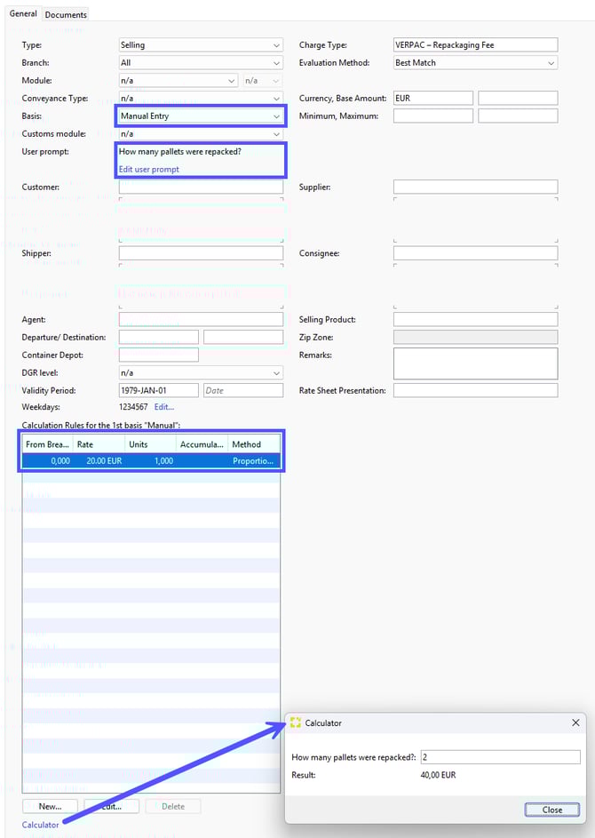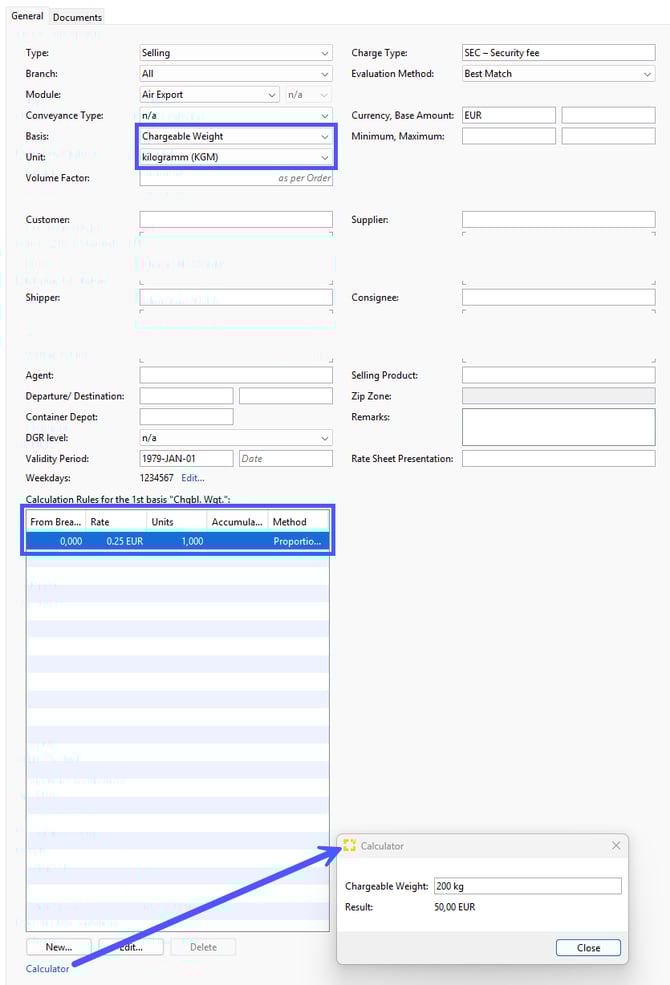 Example: You want to charge your customer the security fee by chargeable weight at a rate of 0.25 EUR per kg.