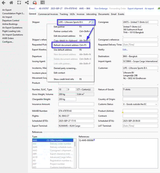 To update the Partner details within an existing shipment, invoice, or customs declaration, open the relevant record, click the arrow in the Partner field, and select “Refresh document address,” or press F5.