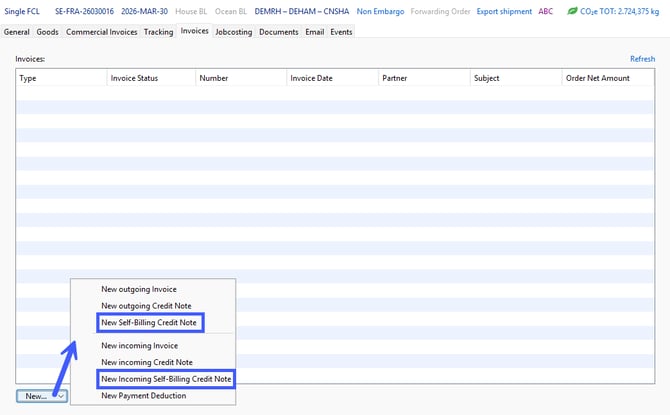 In the Invoices tab of a shipment, you can, among other options, create a new self-billing credit note and the incoming self-billing credit note.