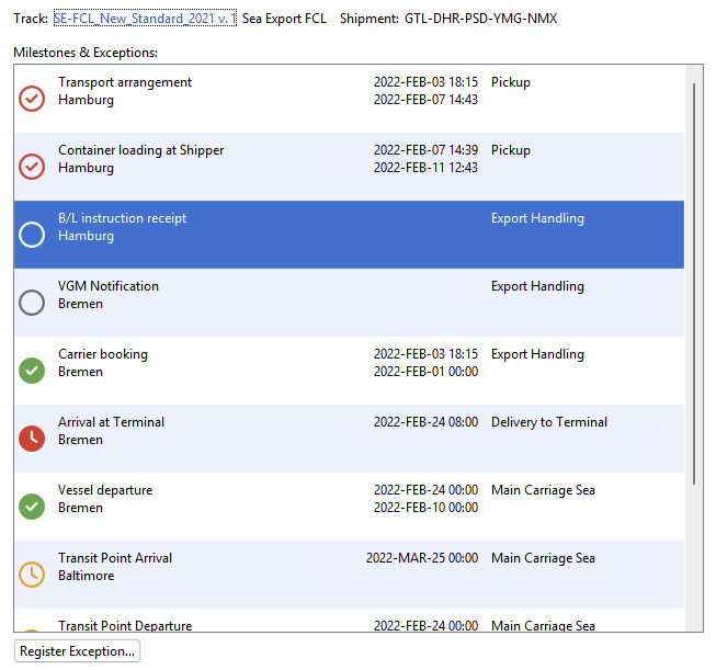The shipment monitor provides real-time information about shipments that may be running off schedule (tracking) and for which action is required. The application provides an overview to better estimate the expected workload for handling the shipments. The data (planned, actual times, actions, exceptions) on shipments can be evaluated as a quality report to control and improve the quality of handling. Via special program actions in the user interface, the shipment data and also the respective tracking plan and its fulfillment can be viewed and edited for each shipment.
