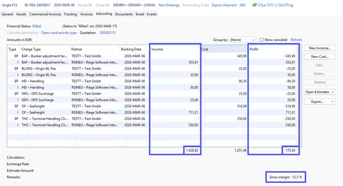 En caso de que se modifique la indicación de Tránsito de un tipo de cargo (marque o desmarque la opción 'Transit item' en Datos Maestros > Finanzas > Conseptos) mientras ya se han creado líneas de cálculo del coste del trabajo haciendo uso de este tipo de cargo, el margen bruto tal y como se informa en el Resumen de Envíos podría no estar actualizado. Será necesario recalcular todos los envíos existentes si se ajusta el indicador de Tránsito. El recálculo se realiza automáticamente si realiza un cambio en el envío y luego lo guarda. Póngase en contacto con el Servicio de Asistencia de Riege en caso de que se requiera un recálculo para muchos envíos que no espera que cambien pronto, para que podamos configurar este recálculo para un periodo específico en los ajustes del sistema.