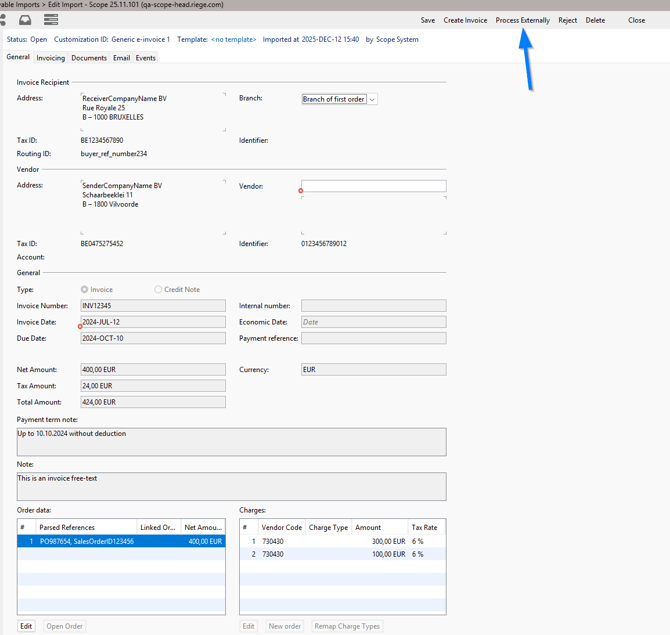 - Abra la Importación de Cuentas por Pagar (E-Invoice) y seleccione “Procesar externamenteProcess externally”. Scope le pedirá que introduzca una nota, en la cual podrá registrar sus comentarios.