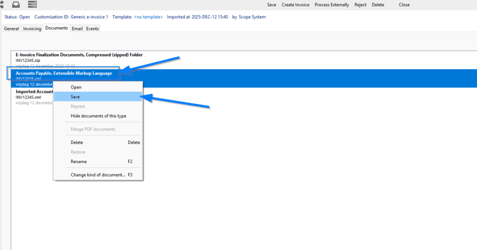 - Para procesar esta factura electrónica en una aplicación externa, vaya a la pestaña Documentos de la factura electrónica, seleccione el documento de “Cuentas por Pagar”, guárdelo localmente y, a continuación, impórtelo/procéselo en su aplicación externa.